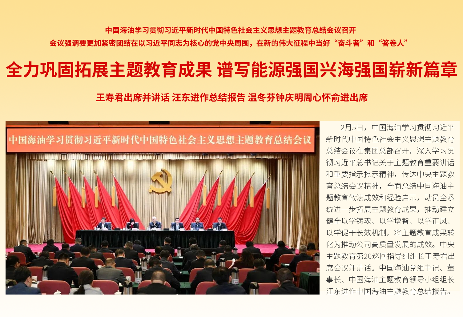中國海油以高標(biāo)準(zhǔn)、嚴(yán)要求、實舉措,扎實開展學(xué)習(xí)貫徹習(xí)近平新時代中國特色社會主義思想主題教育,聚焦主責(zé)主業(yè),強化使命擔(dān)當(dāng),將投身主題教育中煥發(fā)出來的學(xué)習(xí)、工作熱情轉(zhuǎn)化為加快建設(shè)中國特色世界一流能源公司、打造中國式現(xiàn)代化央企新典范的磅礴力量。