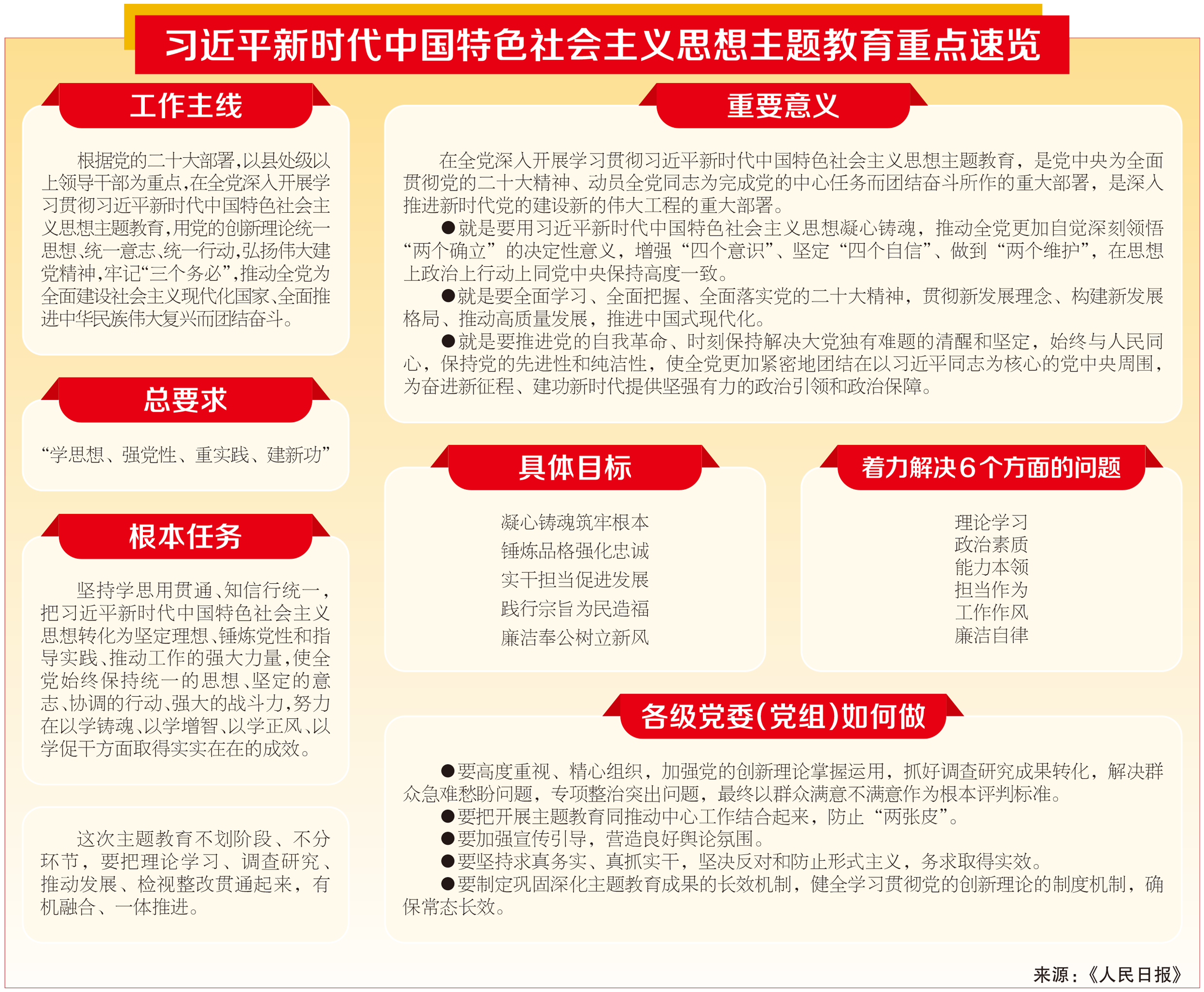 在全黨深入開展學(xué)習(xí)貫徹習(xí)近平新時代中國特色社會主義思想主題教育,是黨中央為全面貫徹黨的二十大精神、動員全黨同志為完成黨的中心任務(wù)而團結(jié)奮斗所作的重大部署,也是深入推進(jìn)新時代黨的建設(shè)新的偉大工程的重大部署。