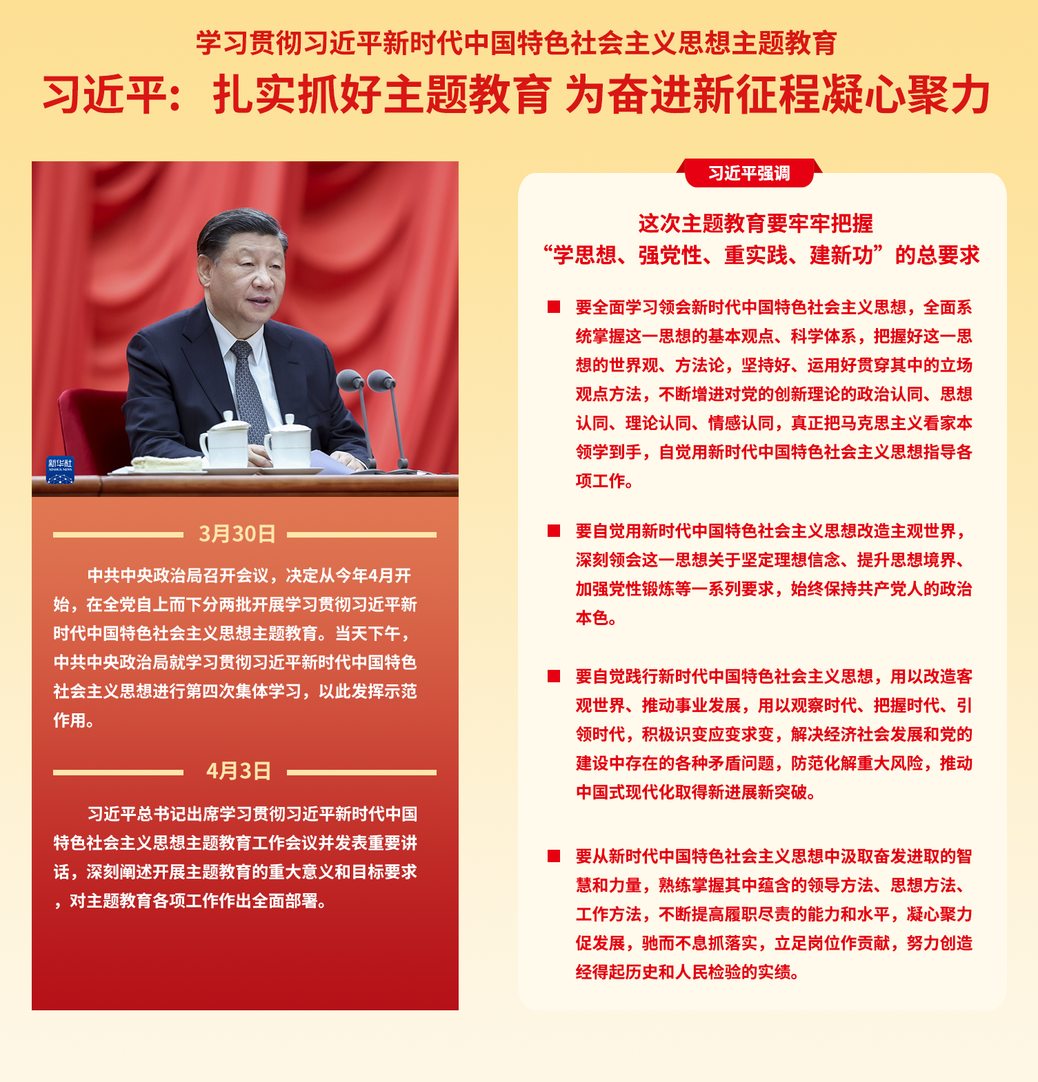 要切實把主題教育謀劃好、組織好、落實好,確保取得扎實成效。要高度重視、精心組織,把開展主題教育作為重大政治任務(wù)抓緊抓好,確保主題教育扎實有序推進(jìn)。要圍繞中心,求真務(wù)實,把開展主題教育同指導(dǎo)實踐、解決問題結(jié)合起來,同生產(chǎn)經(jīng)營、黨建工作結(jié)合起來,同深化改革、創(chuàng)新發(fā)展結(jié)合起來。要注重宣傳引導(dǎo),營造良好氛圍,建立鞏固深化主題教育成果的長效機制,健全學(xué)習(xí)貫徹黨的創(chuàng)新理論的制度機制,確保主題教育常態(tài)長效、持續(xù)用力、久久為功。