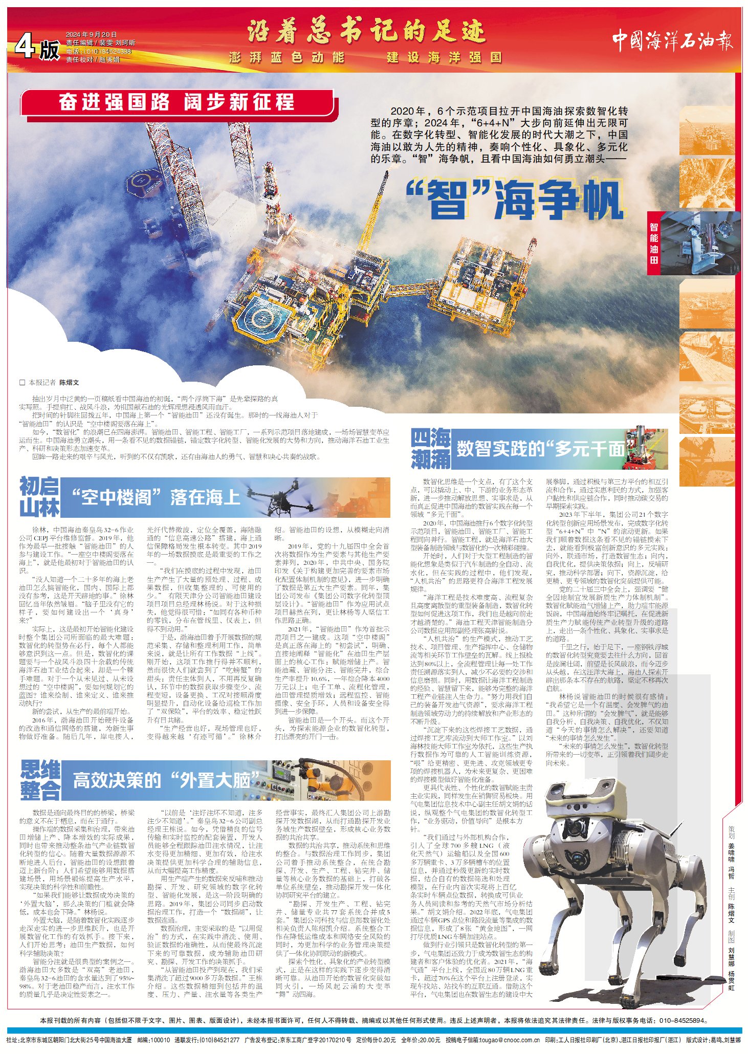 近年來,中國海油推進數(shù)智化轉(zhuǎn)型邁出穩(wěn)健步伐,積極推動數(shù)字技術(shù)與實體經(jīng)濟深度融合,以數(shù)字資源賦能油氣產(chǎn)業(yè)轉(zhuǎn)型升級。大力推動“智能油田”“智能工程”“智能工廠”建設(shè),以秦皇島32-6為代表的一批智能油田項目相繼建成投用,核心業(yè)務(wù)數(shù)字化覆蓋率達到90%,并入選2021年央企數(shù)字化轉(zhuǎn)型十大成果;海上平臺無人化率超過15%,多個油氣田建成臺風生產(chǎn)模式,有力保障本質(zhì)安全;惠州石化建成我國首個“雙頻5G+工業(yè)互聯(lián)網(wǎng)”智能煉廠,生產(chǎn)數(shù)據(jù)自動采集率超98%;海油工程天津智能化制造基地正式投產(chǎn),推動預制作業(yè)環(huán)節(jié)提效近20%,標志著我國海洋油氣裝備制造數(shù)智化轉(zhuǎn)型實現(xiàn)重大突破。