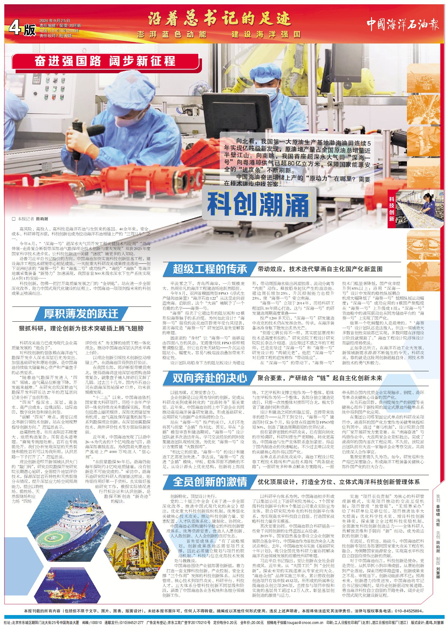 中國海油深入貫徹落實習近平總書記關(guān)于科技創(chuàng)新的重要論述,加快實施科技創(chuàng)新強基工程,推進海洋工程技術(shù)研發(fā)中心建設(shè)不斷取得新成效。10年來,中國海油研發(fā)投入穩(wěn)定增長,發(fā)布國際標準5項、國家標準160余項,獲授權(quán)專利10000余項,獲得省部級及以上科技獎140余項,科技創(chuàng)新有力支撐海洋油氣上中下游全產(chǎn)業(yè)鏈取得重大突破。